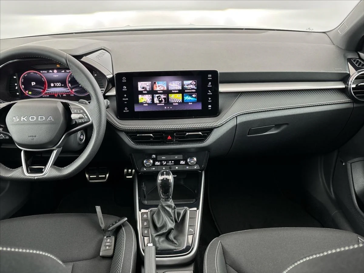 další informace k výbavě získáte u našich prodejců; OBECNÉ: fotografie vozu je ve skladovém režimu s ochrannými fóliemi; adaptivní vedení v jízdním pruhu; EXTRA VÝBAVA: 130 plus (asistovaná jízda 1.5+ - adaptivní tempomat; hlídání mrtvého úhlu) + Infotainment Navi 9; 2' + web rádio + digitální asistentka Laura + audiosystém Škoda s dojezdovým rezervním kolem + vyhřívané čelní sklo + ostřikovače předních světlometů